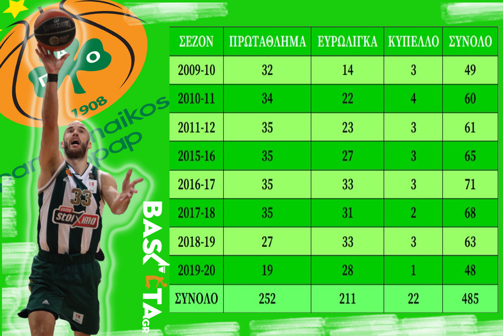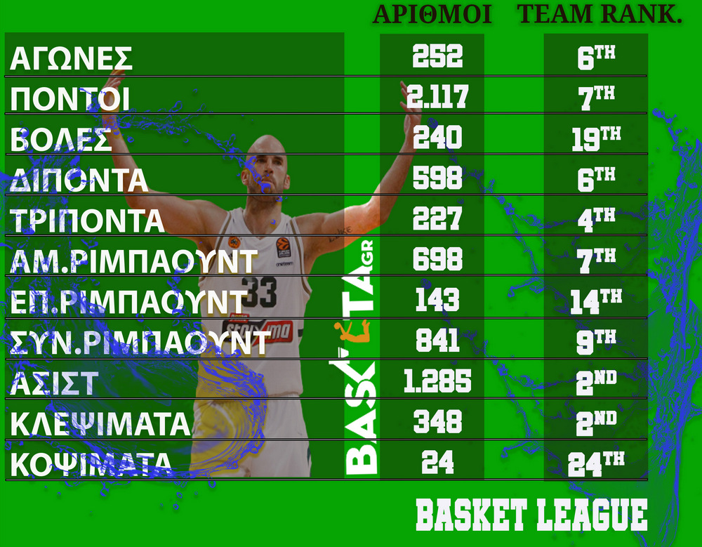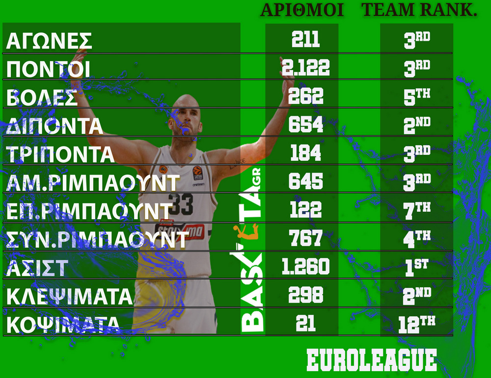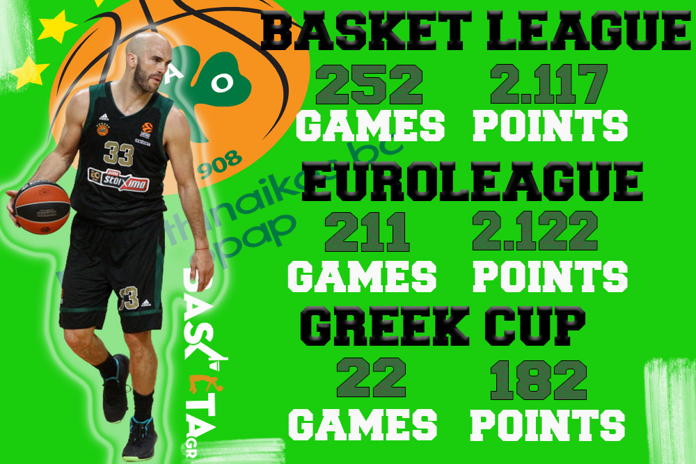 Πολλά παιχνίδια, σκοράρισμα και βέβαια ασίστ και κλεψίματα. Ο διεθνής γκαρντ έκλεισε την 8ετία όντας πολύ ψηλά στις ιστορικές λίστες του Παναθηναϊκού, τόσο στο Πρωτάθλημα όσο και στην Ευρωλίγκα...