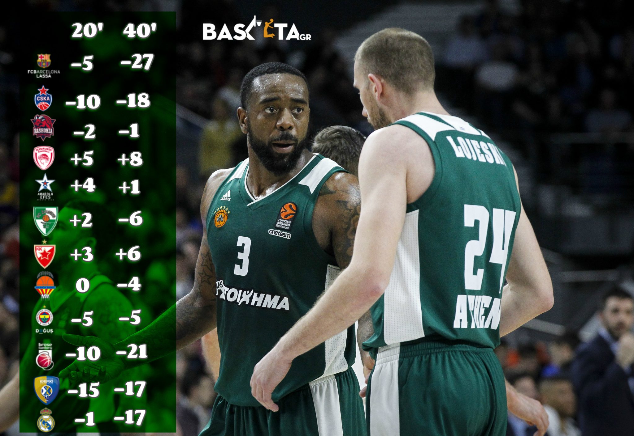 *Σε εννιά από τα 12 εκτός έδρας παιχνίδια του, ο Παναθηναϊκός μειονέκτησε στα επιμέρους σκορ της 4ης περιόδου. Μόνο δύο φορές είχε θετικό πρόσημο στο τελευταίο δεκάλεπτο και αυτό έγινε στα ματς με τον Ολυμπιακό (15-21), τη Ζαλγκίρις (16-27) ενώ ήταν ισόπαλος με τη Χίμκι (15-15).