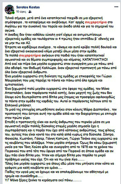 Αναλυτικά έγραψε : «Τελικά σήμερα, μετά από ένα καταπληκτικό παιχνίδι σε μια εξαιρετική ατμόσφαιρα , τα καταφέραμε και ανεβήκαμε. Κατ' αρχάς συγχαρητήρια στο Αιγάλεω για την συνολική του πορεία και άνοδο αλλά και για το σημερινό του αγώνα.