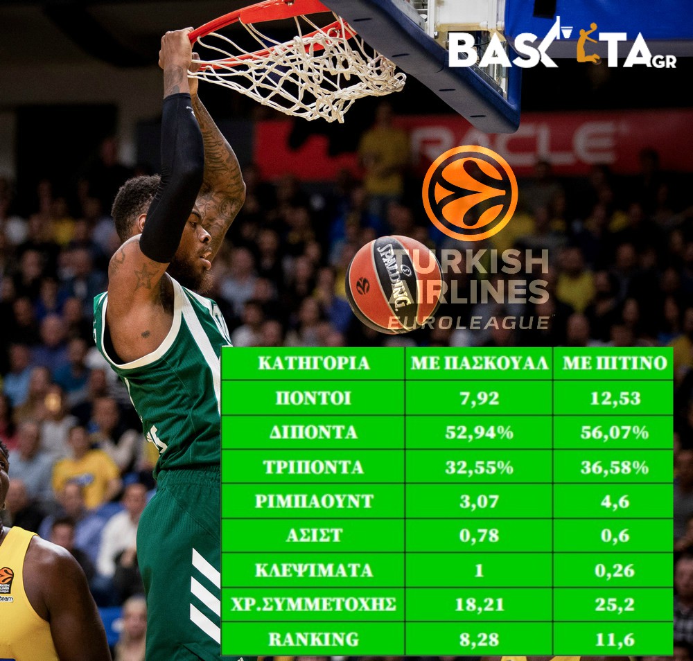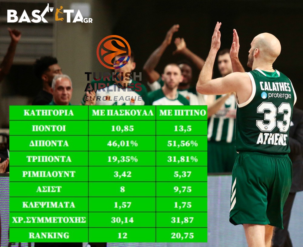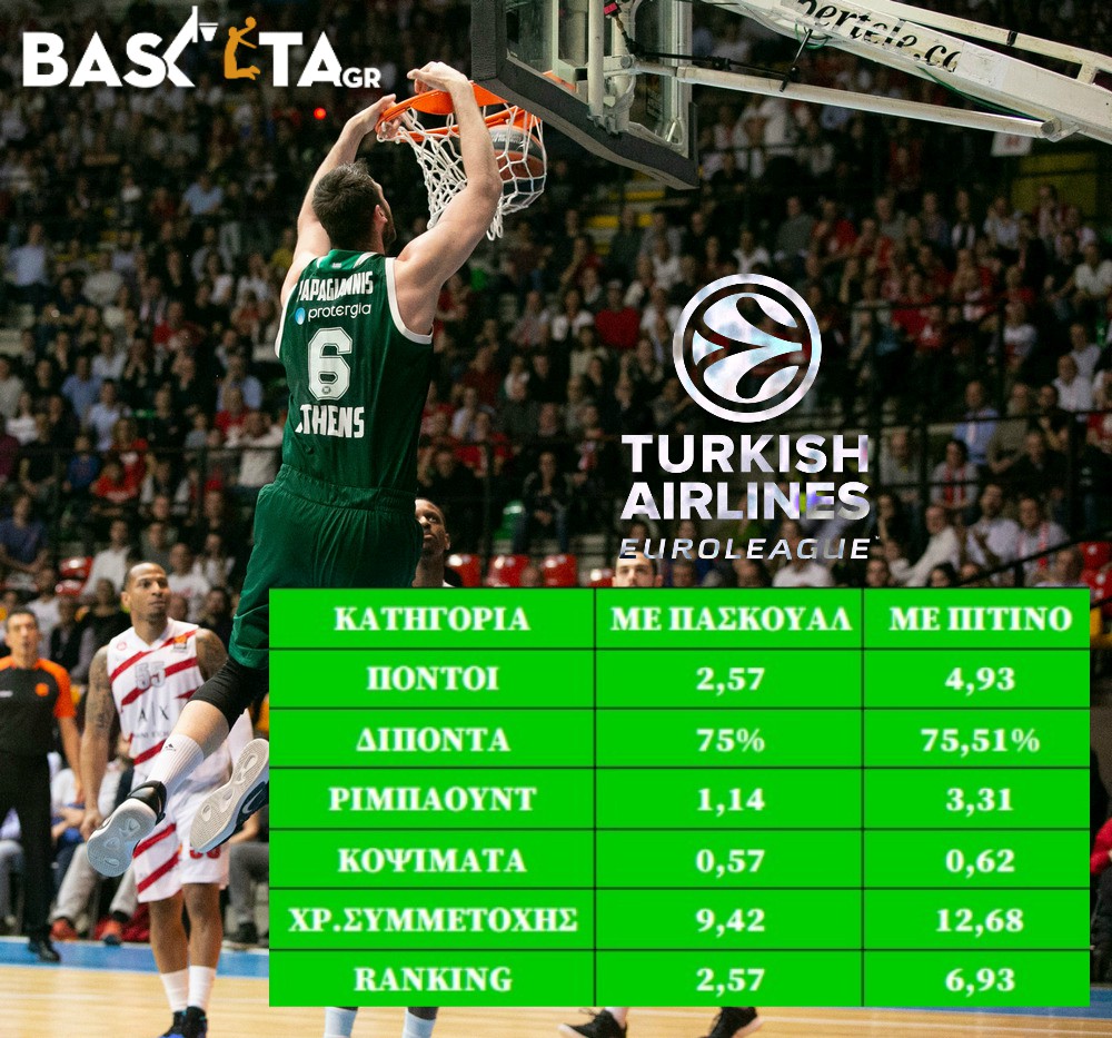 Είναι εντυπωσιακό το γεγονός ότι με τον Πιτίνο όχι μόνο σκοράρισε περισσότερο και με καλύτερα ποσοστά, αλλά πήγαινε περισσότερο στο ριμπάουντ και μοίραζε ακόμη περισσότερες ασίστ.