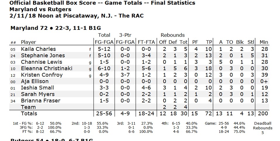 Η διεθνής γκαρντ ήταν η κορυφαία σήμερα για την ομάδα της με 18 πόντους και 6 ριμπάουντ σε 30’. Και δεν είναι μόνο ότι ήταν η πρώτη σκόρερ και η πρώτη ριμπάουντερ, αλλά ήταν αυτή που πήρε από το χέρι την ομάδα της όταν ακόμη οι Rutgers απειλούσαν στο δεύτερο δεκάλεπτο. Έβαλε συνεχόμενους πόντους και βοήθησε το Μέριλαντ να διευρύνει τη διαφορά και να φτάσει στη νίκη με το τελικό 72-54.