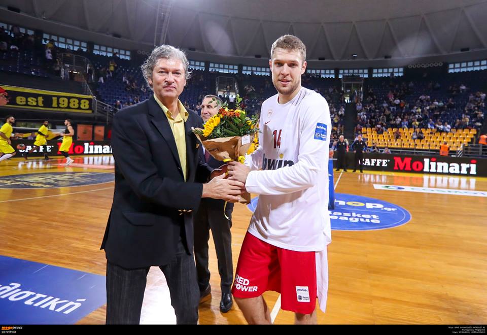 Ο Άρης δεν ξέχασε τον Ντέιβιντ Μπλατ, αλλά και τον Αλέξανδρο Βεζένκοφ. Έτσι πριν από το τζάμπολ ο Χάρης Παπαγεωργίου τους έδωσε από μια ανθοδέσμη θέλοντας να υποδεχθεί τον προπονητή του Ολυμπιακό με ένα θερμό τρόπο, καθώς ο Μπλατ έχει διατελέσει και προπονητής του Άρη στο παρελθόν (2010). Ο Βεζένκοφ είχε ουσιαστικά ξεκινήσει από την ομάδα και την επισκέπτεται πρώτη φορά από τότε.
