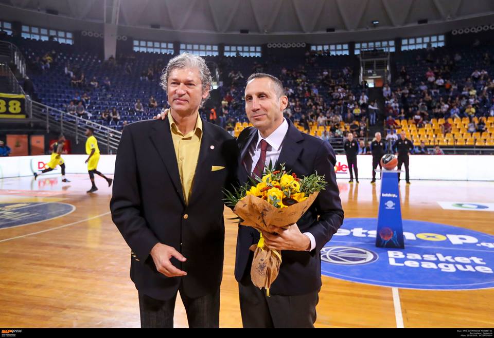 Ο Άρης δεν ξέχασε τον Ντέιβιντ Μπλατ, αλλά και τον Αλέξανδρο Βεζένκοφ. Έτσι πριν από το τζάμπολ ο Χάρης Παπαγεωργίου τους έδωσε από μια ανθοδέσμη θέλοντας να υποδεχθεί τον προπονητή του Ολυμπιακό με ένα θερμό τρόπο, καθώς ο Μπλατ έχει διατελέσει και προπονητής του Άρη στο παρελθόν (2010). Ο Βεζένκοφ είχε ουσιαστικά ξεκινήσει από την ομάδα και την επισκέπτεται πρώτη φορά από τότε.