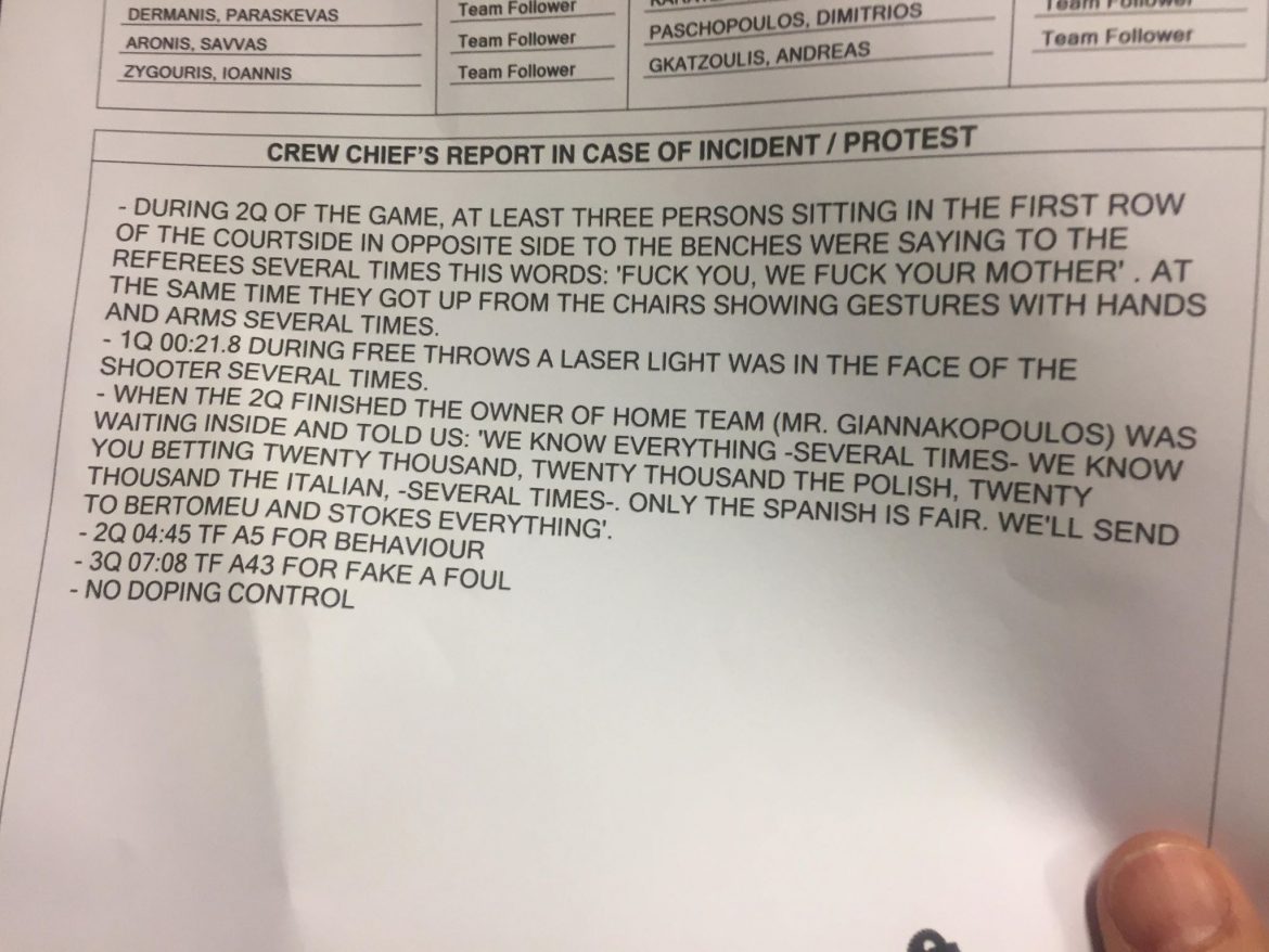 Στο φύλλο αγώνα οι τρεις διαιτητές έγραψαν επίσης για τρία άτομα στα court seats, που τους έβριζαν και εκαναν χειρονομίες εναντίον τους στη διάρκεια του αγώνα.