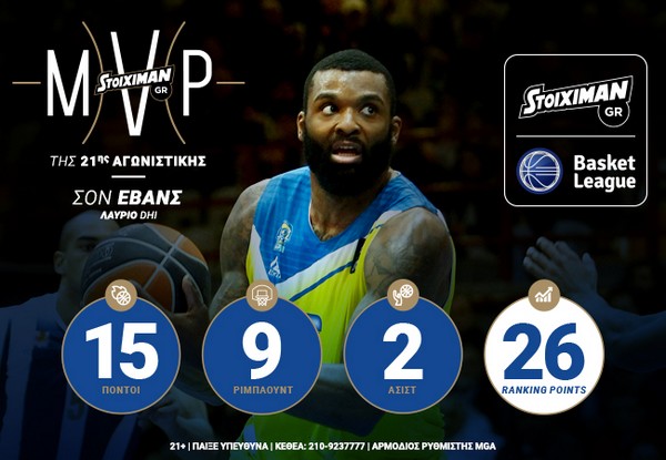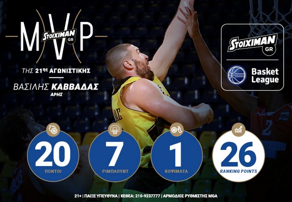 Δύο σέντερ αναδείχθηκαν πολυτιμότεροι παίκτες στην 21η αγωνιστική της Basket League. Ο λόγος για τους Βασίλη Καββαδά του Άρη και Σον Έβανς του Λαυρίου.