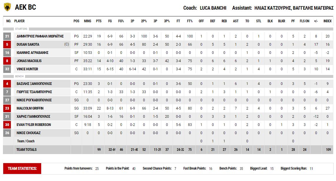 Η ΑΕΚ έδειξε χαρακτήρα στην παράταση. Παρά την άσχημη τροπή του αγώνα στα τελευταία 15 λεπτά, η ομάδα του Μπάνκι κατάφερε να φτάσει στη νίκη μέσα από τις ψύχραιμες επιλογές της. Η άμυνα έσφιξε και πάλι, ήρθαν επιθετικές λύσεις από Γκρίφιν και Σάκοτα, με τον Ματσιούλις να σφραγίζει τη νίκη πρωτιάς για την ομάδα του με δύο μεγάλα τρίποντα χάρη στα οποία διαμόρφωσε το σκορ στο 89-96 με 1,5 λεπτό για το τέλος!