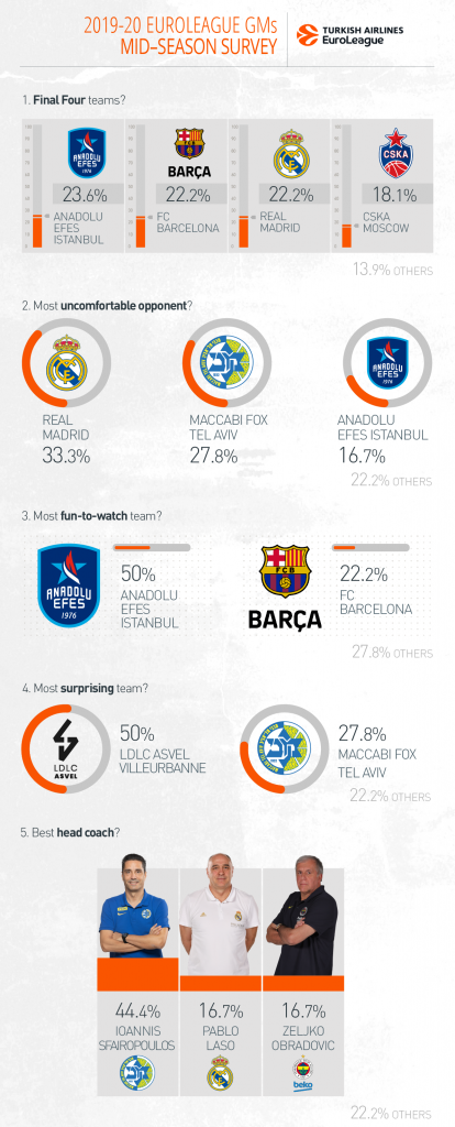 Η Αναντόλου Έφες είναι στην κορυφή σε ότι αφορά το ποια ομάδα είναι πιο διασκεδαστική ομάδα να βλέπεις με δεύτερη την Μπαρτσελόνα. Οι δυο τους βρίσκονται και στις πιθανότερες να φτάσουν στο Final Four με το καρέ να συμπληρώνουν η ΤΣΣΚΑ Μόσχας και η Ρεάλ Μαδρίτης. Είναι η πρώτη φορά που η Φενέρμπαχτσε δεν βρίσκει θέση στην τετράδα, ενώ δεν υπάρχει καμία από τις δύο ελληνικές ομάδες, Παναθηναϊκό ή Ολυμπιακός στην κορυφή της λίστας των προτιμήσεων.