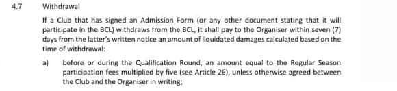 Το BCL ενημέρωσε τη Βίρτους Μπολόνια πως θα πρέπει να καταβάλει το ποσό των 250.000 ευρώ, σύμφωνα με το συμβόλαιο που η ίδια η ιταλική ομάδα είχε υπογράψει, όταν έδωσε τα χέρια με το Basketball Champions League. Η απόφασή της να στραφεί σε μια διαφορετική διοργάνωση, στην περίπτωσή της το EuroCup, ενεργοποιεί τη σχετική ρήτρα.