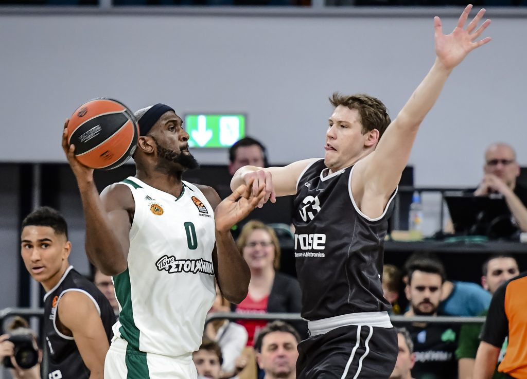 Ο Ντέγιαν Μούσλι ήταν το σημείο αναφοράς στο πρώτο δεκάλεπτο στον αγώνα, αφού αυτόν αναζήτησαν στο κέντρο της ρακέτας οι συμπαίκτες του, με το 9-7 να γράφεται με επτά δικούς του πόντους κα τον Παναθηναϊκό να βρίσκεται εκεί, μέσα στο παιχνίδι, χωρίς όμως να μπορεί να προσπεράσει. Ράιτ και Ολίντε πήραν τη σκυτάλη από τον Σέρβο σέντερ, για να φτάσουν 13-9 (5’) και το 25-17 (10’30’’). Οι «πράσινοι» φαινόταν να έχουν πρόβλημα και στις δύο πλευρές του γηπέδου, επιτρέποντας εύκολα σουτ στους Γερμανούς, ενώ παράλληλα είχαν υποπέσει σε επτά φάουλ σε κάτι λιγότερο από εννέα λεπτά, δίνοντας νωρίς και ελεύθερες βολές. Και στην επίθεση είχαν ήδη μετρήσει 1/9 τρίποντα σε ένα δεκάλεπτο!