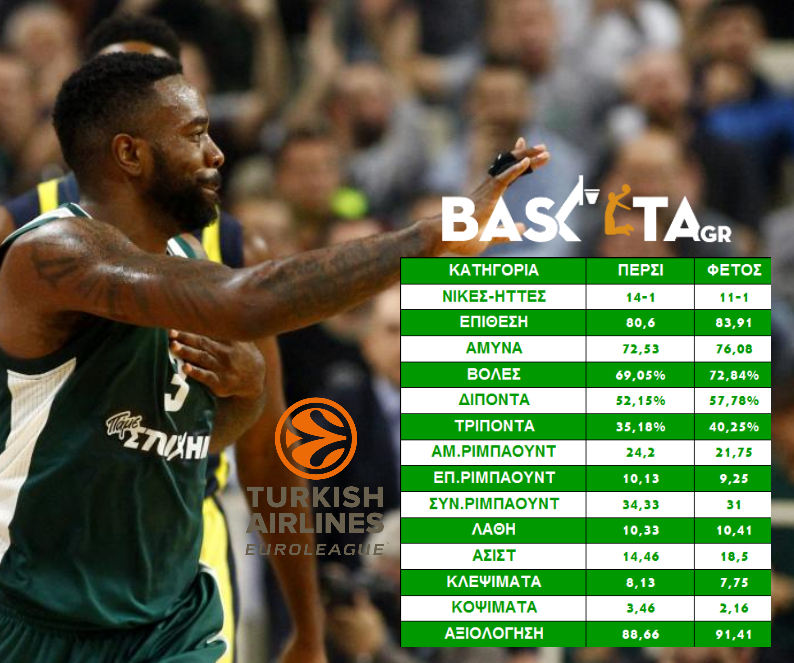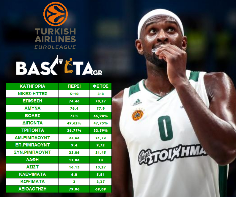 Συγκρίνοντας τους αριθμούς του Παναθηναϊκού στα εκτός έδρας παιχνίδια του, φέτος με πέρσι, γίνεται προφανές ότι φέτος σκοράρει λιγότερο (-4,19) αλλά ταυτόχρονα έχει και χειρότερο αμυντικό παθητικό (+1,5). Αξιοσημείωτο είναι και το ότι χάνει κατά μέσο όρο έξι βολές γεγονός που τον οδηγεί σε χαμηλό ποσοστό, σαφώς χειρότερο του περσινού (-9%). Η ομάδα του Πασκουάλ σουτάρει με χαμηλότερα ποσοστά τόσο στα δίποντα όσο και στα τρίποντα και βέβαια η αδυναμία μιας επιθετικής ομάδας να φτάσει τους 80 πόντους –το έκανε μόνο σε δύο από τα 11 εκτός έδρας παιχνίδια της- βρίσκει εύκολα εξηγήσεις με τα ποσοστά ευστοχίας και τη μικρότερη δημιουργία.