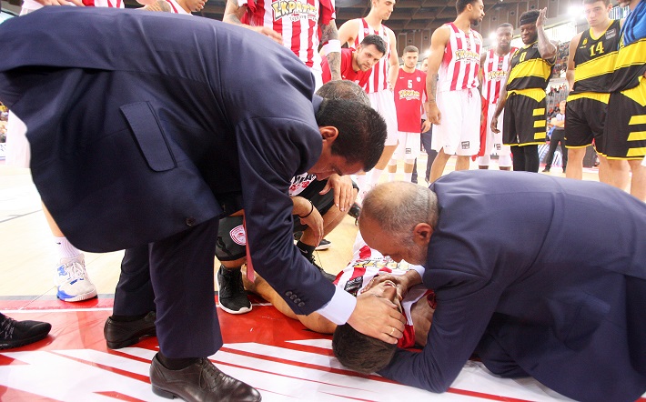 Σε μια προσπάθειά του να αμυνθεί δέχτηκε ακούσιο χτύπημα κοντά στην καρωτίδα, έπεσε στο παρκέ δείχνοντας να χάνει τις αισθήσεις του και φυσικά όλοι έσπευσαν με αγωνία κοντά του.