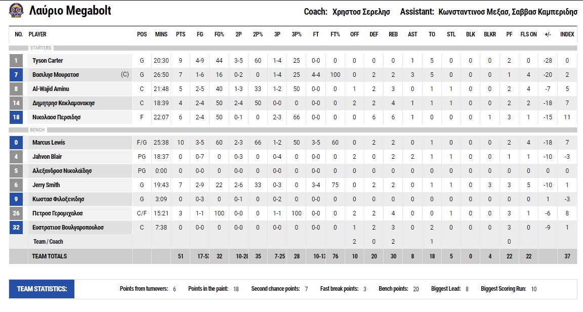 Η επιθετική παραγωγικότητα της ομάδας της λαυρεωτικής λέει σχεδόν τα πάντα για τη σημερινή εικόνα της. Με εξαίρεση την πρώτη περίοδο έμεινε χαμηλά στην επίθεση ενώ είχε μόνο έναν παίκτη με διψήφιο αριθμό πόντων κι αυτός τον έφτασε… οριακά (Λιούις 10).