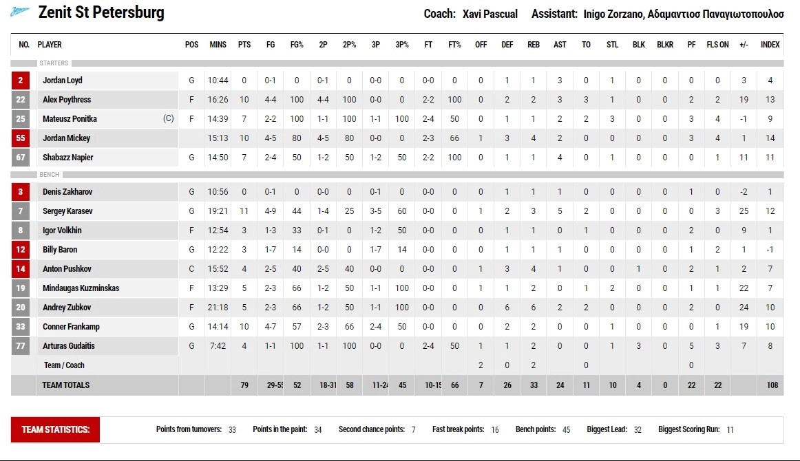 Το Λαύριο έκανε ένα πολύ καλό πρώτο δεκάλεπτο και προηγήθηκε με 21-15, όμως στο δεύτερο έδειξε μία εικόνα που παρέπεμπε στην προηγούμενη μέρα. Δυσκολεύτηκε πολύ επιθετικά ενώ δεν λειτούργησε καλά ούτε στο πρώτο μισό του παρκέ. Η Ζενίτ έκανε ένα επιμέρους 26-7 και έκλεισε το ημίχρονο προηγούμενη με 41-28.