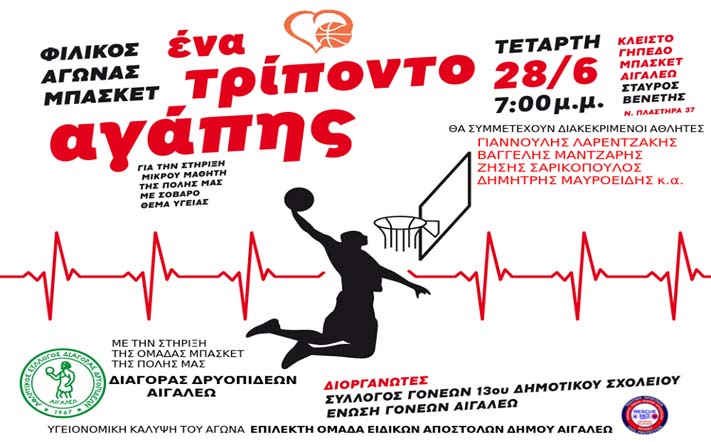 "Ένα τρίποντο αγάπης  " Ένας αγώνας Μπάσκετ για καλό σκοπό συνδιοργανώνεται από τον Σύλλογο Γονέων του 13ου δημοτικού σχολείου και την ΈΝΩΣΗ ΓΟΝΕΩΝ Αιγάλεω, με την πολύτιμη στήριξη και βοήθεια της Ομάδας Μπάσκετ της πόλης μας "ΔΙΑΓΟΡΑΣ ΔΡΥΟΠΙΔΕΩΝ ΑΙΓΑΛΕΩ"