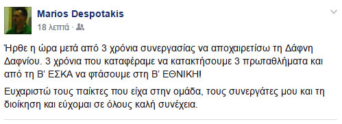 «Ήρθε η ώρα μετά από 3 χρόνια συνεργασίας να αποχαιρετίσω τη Δάφνη Δαφνίου. 3 χρόνια που καταφέραμε να κατακτήσουμε 3 πρωταθλήματα και από τη Β’ ΕΣΚΑ να φτάσουμε στη Β’ ΕΘΝΙΚΗ!