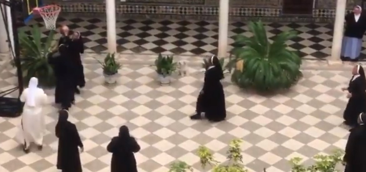 To μπάσκετ φαίνεται πως λείπει και στις μοναχές στη Σεβίλλη. Αφού έστειλαν πρώτα το σχετικό μήνυμα για άσκηση, βγήκαν στην αυλή της Μονής Σαν Λεάνδρο για ένα διάλειμμα. Η αποστολή τους αυτές τις μέρες είναι ιερή άλλωστε, καθώς ράβουν ασταμάτητα μάσκες που δίνουν σε νοσοκομείο. Οπότε η άδεια για λίγο μπάσκετ δόθηκε ευχαρίστως! Σίγουρα και ο Κύριος που επέλεξαν να υπηρετήσουν θα συμφωνεί.