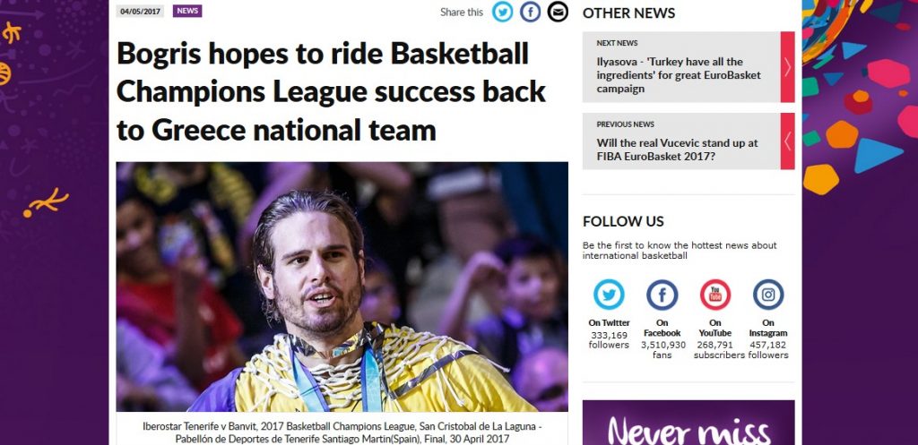 Σήκωσε την κούπα, το πανηγύρισε, θα είναι για πάντα μέρος μιας ιστορικής στιγμής για την Ιμπεροστάρ Τενερίφε στο πρώτο της ευρωπαϊκό τρόπαιο, αλλά και της ίδιας της διοργάνωσης, ως μέλος της πρώτης ομάδας που κατέκτησε τον τίτλο. Όλα αυτά με την ελληνική σημαία μαζί του σε όλη τη διαδρομή. Από τη λήξη, ως τη στέψη, ως τους πανηγυρισμούς, ως το Δημαρχείο.. Ο Γιώργος Μπόγρης δεν έχει κρύψει ποτέ την αγάπη του για την Ελλάδα, πολύ περισσότερο τώρα που είνα εκτός συνόρων εδώ και τρία χρόνια και κατ’ επέκταση για την Εθνική Ομάδα. Άλλωστε από τα 14 του είναι εκεί... Κάθε καλοκαίρι, όλο το καλοκαίρι, σε όλες τις "μικρές" εθνικές και εσχάτως δύο καλοκαίρια με τους... μεγάλους. Αυτή την αγάπη του, επιθυμία του, ευχή του, όπως θέλετε πείτε το διατύπωσε για μία ακόμη φορά στα όσα είπε στο επίσημο σάιτ της FIBA στη συνέντευξη που ακολουθεί: