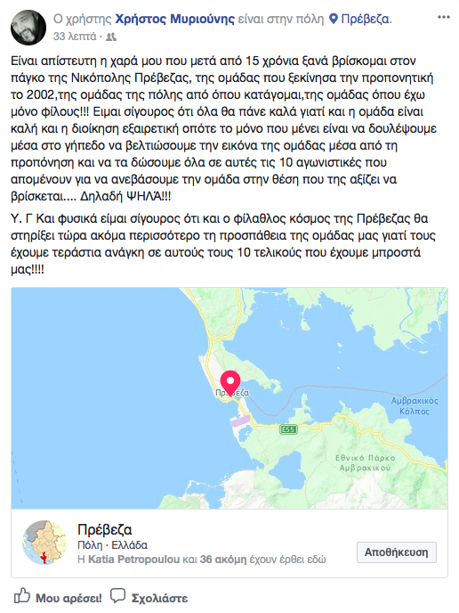 Υ. Γ Και φυσικά είμαι σίγουρος ότι και ο φίλαθλος κόσμος της Πρέβεζας θα στηρίξει τώρα ακόμα περισσότερο τη προσπάθεια της ομάδας μας γιατί τους έχουμε τεράστια ανάγκη σε αυτούς τους 10 τελικούς που έχουμε μπροστά μας!!!!».