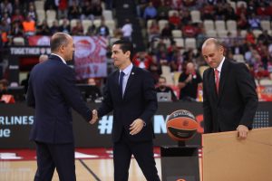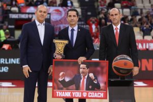 Ο Γιάννης Σφαιρόπουλος έχει απόψε την... τιμητική του και οι «ερυθρόλευκοι» το δείχνουν με κάθε τρόπο. Μετά το χειροκρότημα του κόσμου προς το πρόσωπο του Έλληνα τεχνικού, σειρά πήραν οι πρόεδροι του Ολυμπιακού, Παναγιώτης και Γιώργος Αγγελόπουλος οι οποίοι πριν την έναρξη του ματς τον βράβευσαν για την τετραετή του προσφορά στην ομάδα του Πειραιά.