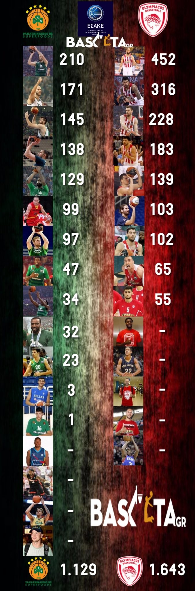 Η συνολική καταμέτρηση βγάζει 1.643 ματς για τους παίκτες του Ολυμπιακού και 1.129 για εκείνους του Παναθηναϊκού.
