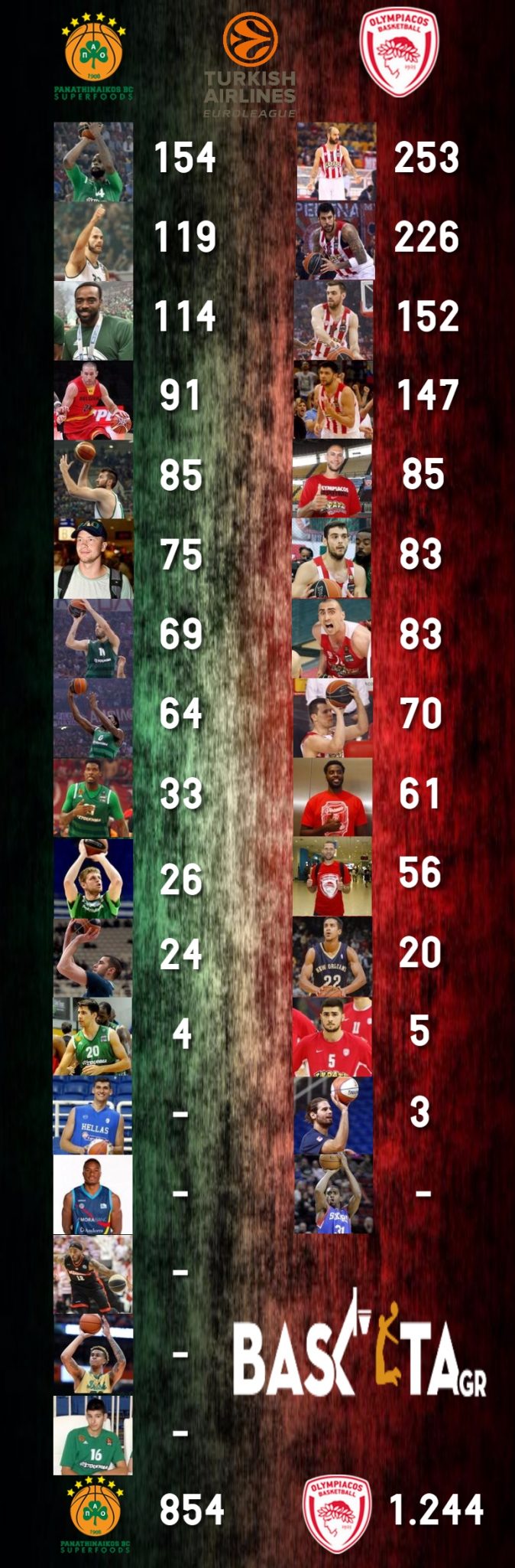 Επιχειρώντας την αντίστοιχη σύγκριση με βάση τους αριθμούς της Ευρωλίγκας, ο Παναθηναϊκός έχει τρεις παίκτες με τριψήφιο αριθμό αγώνων στη διοργάνωση ενώ έχει τέσσερις πρωτοεμφανιζόμενους. Ο Ολυμπιακός από την πλευρά του έχει τέσσερις τριψήφιους σε συμμετοχές και μόνον ο Χόλις Τόμπσον είναι «ρούκι». Συνολικά οι παίκτες του ερυθρόλευκου ρόστερ μετρούν 1.244 συμμετοχές στην Ευρωλίγκα και εκείνοι του πράσινου 854.