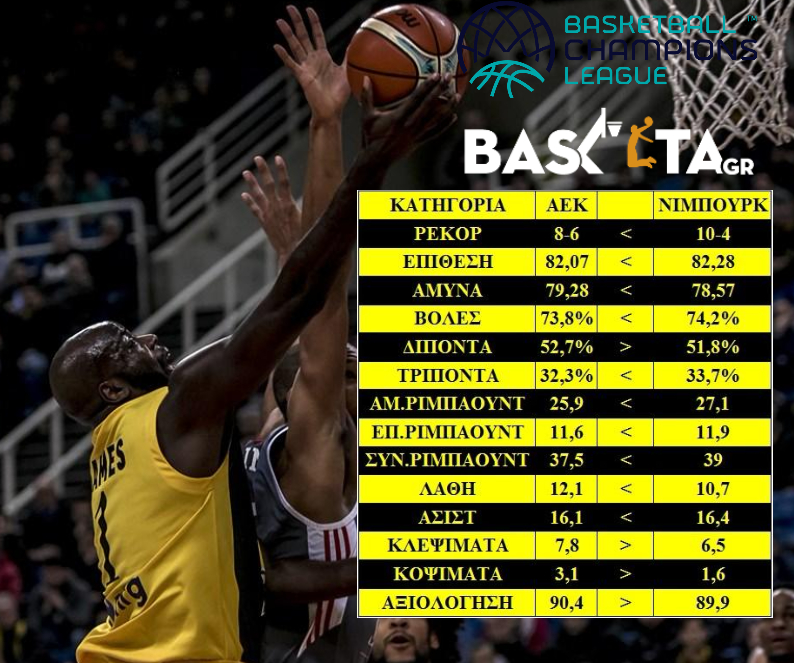 Το basketa.gr συνέκρινε τους αριθμούς των δύο ομάδων που θα «συγκρουστούν» τον Μάρτιο για μία θέση στα προημιτελικά του BCL και βάσει αυτών φαίνεται πως συγκροτούν ένα πολύ ισορροπημένο ζευγάρι με την ΑΕΚ όμως να έχει έναν λόγο παραπάνω από τη Νίμπουρκ.