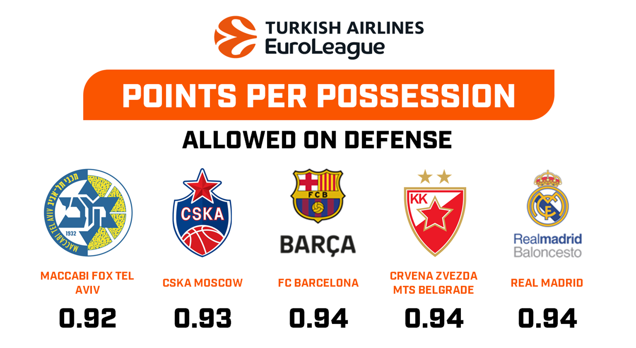 Στον αντίποδα, κοιτώντας τον χάρτη των ομάδων που δέχονται τους λιγότερους πόντους ανά κατοχή, το σκηνικό αλλάζει αρκετά, καθώς εκεί, τον πρώτο λόγο έχει η Μακάμπι Τελ Αβίβ, επιτρέποντας 0.92 πόντους. Μόλις δυο ομάδες βρίσκονται παράλληλα και στις δύο πίνακες, η Μπαρτσελόνα και η Ρεάλ Μαδίτης, δεχόμενες αμφότερες 0.94 πόντους ανα κατοχή. Τόσους δέχεται και ο Ερυθρός Αστέρας, αν και βρίσκεται εκτός της οχτάδας που οδηγεί στα πλει οφς της διοργάνωσης, μετρώντας μόλις 10 νίκες και 15 ήττες. Καλή δουλειά στην άμυνα κάνει και η ΤΣΣΚΑ Μόσχας, που δέχεται 0.93 πόντους σε κάθε κατοχή.