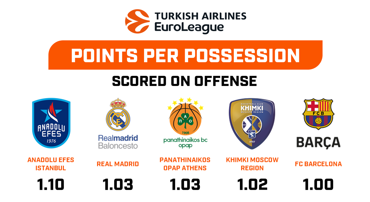Η δεύτερη Ρεάλ Μαδρίτης (19-6) είναι επίσης δεύτερη σε πόντους ανά κατοχή με 1.03, όσους ακριβώς σκοράρει και ο Παναθηναϊκός, παρότι βρίσκεται στην 6η θέση του βαθμολογικού πίνακα με ρεκόρ 14-11, αλλά όντας η πιο επιθετική ομάδα μέχρι στιγμής, με μέσο όρο 88.7 πόντους σε κάθε αναμέτρηση.