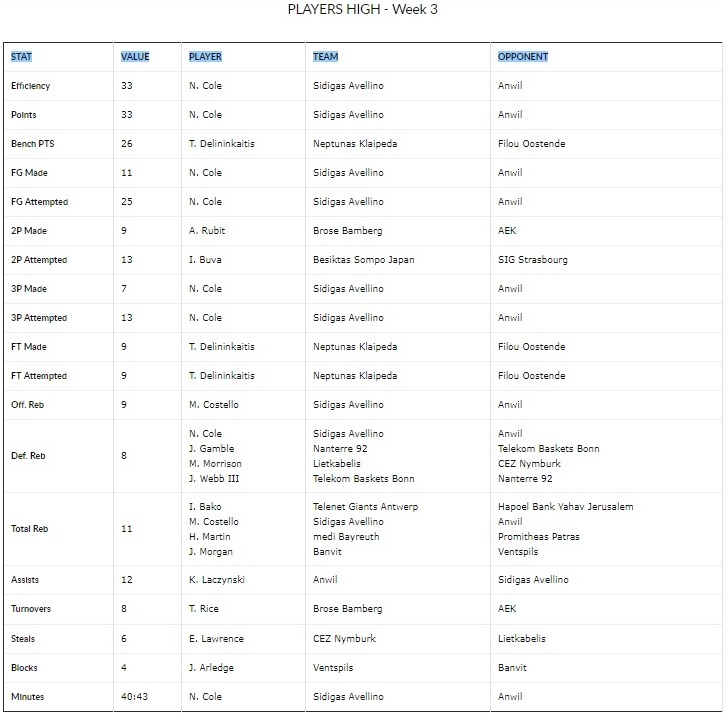 -Κανένας παίκτης της ΑΕΚ, του ΠΑΟΚ και του Προμηθέα Πατρών δεν πρώτευσε σε κάποια από τις στατιστικές κατηγορίες, στο πλαίσιο της 3ης αγωνιστικής του BCL. Δείτε, στον παρακάτω πίνακα, ποιοι ξεχώρισαν το διήμερο 23-24/10…