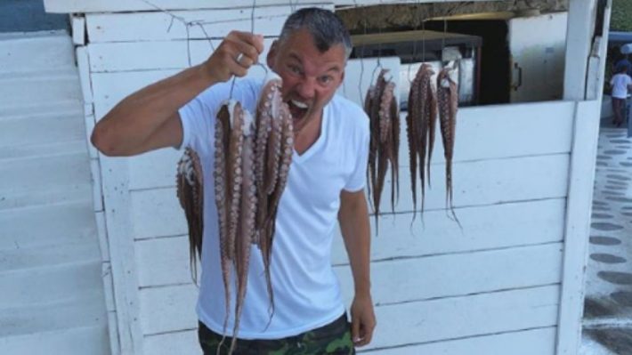 Ο Λιθουανός τεχνικός, που βρίσκεται αυτές τις μέρες στη Μύκονο, σε φωτογραφία που ανέβασε στα social media, ποζάρει δίπλα σε ένα ζευγάρι χταπόδια σχολιάζοντας χιουμοριστικά την... "κουβεντούλα" που είχε μαζί τους.