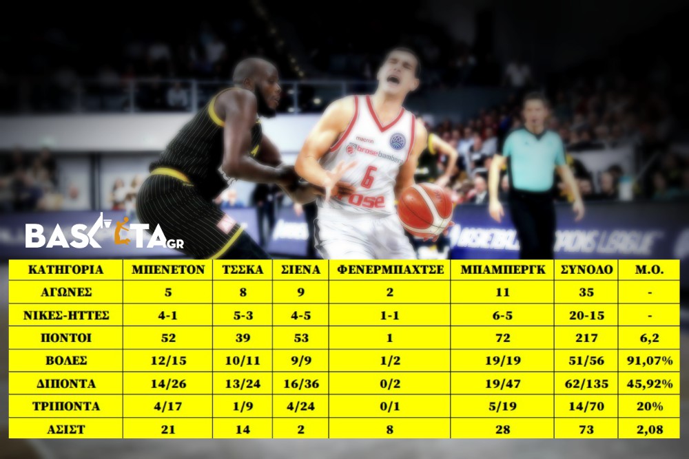 2017-18 (Κανονική περίοδος) Μπάμπεργκ-Παναθηναϊκός 95-74 (4π, 2/3δ, 1ρ, 2ασ.)