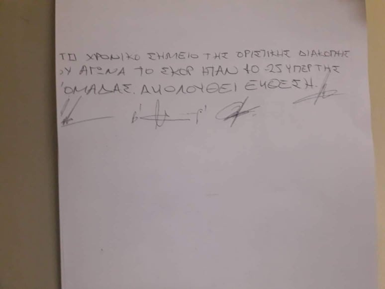 «Ο αγώνας διεκόπη οριστικά σε βάρος της β' ομάδος (σ.σ. Ολυμπιακός), διότι δεν εμφανίστηκε στο στον αγωνιστικό χώρο για την έναρξη του β' ημιχρόνου. Χορηγήθηκε προθεσμία 15 λεπτών, μετά το πέρας της οποίας έκλεισε οριστικά το φύλλο αγώνα. Στο χρονικό σημείο της οριστικής διακοπής του αγώνα, το σκορ ήταν 40-25 υπέρ της α' ομάδας (σ.σ. Παναθηναϊκός). Ακολουθεί έκθεση», αναφέρουν οι διαιτητές του αγώνα.
