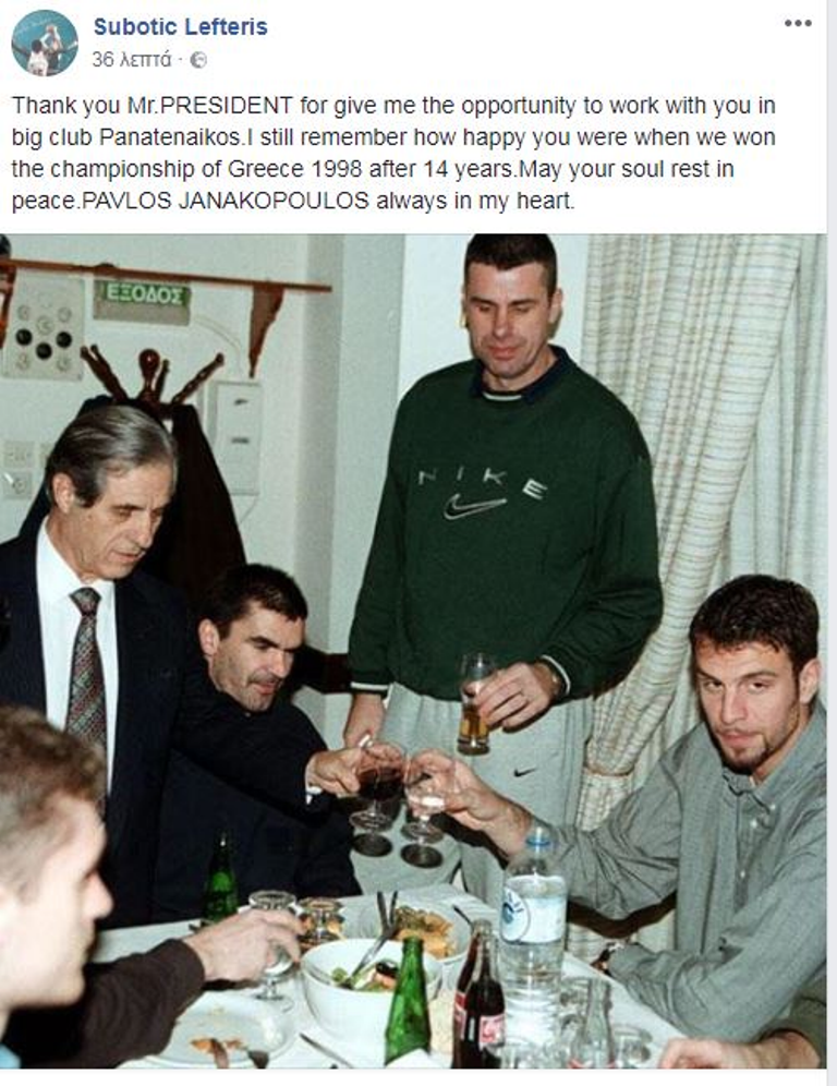 Συγκινητικό ήταν και το μήνυμα του Λευτέρη Σούμποτιτς, μέσω του προσωπικού λογαριασμού του στο Facebook. «Σε ευχαριστώ κύριε Πρόεδρε για την ευκαιρία που μου έδωσες να δουλέψω μαζί σου σε ένα μεγάλο σύλλογο όπως ο Παναθηναϊκός. Ακόμα θυμάμαι πόσο χαρούμενος ήσουν όταν κατακτήσαμε το πρωτάθλημα Ελλάδα το 1998, μετά από 14 χρόνια. Είθε η ψυχή σου να αναπαυθεί εν ειρήνη. Παύλος Γιαννακόπουλος, για πάντα στην καρδιά μου», έγραψε ο 61χρονος τεχνικός.