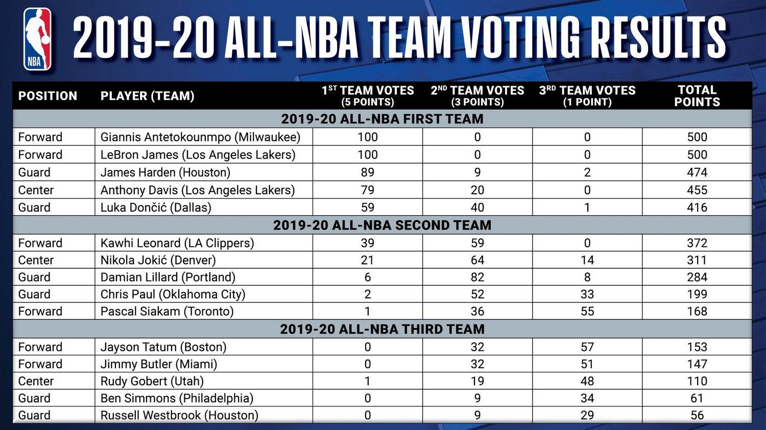 Στην all star πεντάδα βρίσκεται βέβαια ο Γιάννης Αντετοκούνμπο που είναι το φαβορί για τον τίτλο και του MVP, για δεύτερη συνεχόμενη σεζόν. Οι υπόλοιποι είναι ο Λούκα Ντόντσιτς, ο Τζέιμς Χάρντεν, ο Λεμπρόν Τζέιμς και ο Άντονι Ντέιβις. Είναι χαρακτηριστικό μάλιστα, ότι ο Έλληνας σούπερ σταρ και ο «King» έλαβαν τον απόλυτο αριθμό των πρώτων ψήφων!