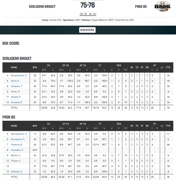 Ο ΠΑΟΚ έσπασε αυτήν την παράδοση και έγραψε ιστορία, νικώντας τη Βερόνα με 76-75 παίρνοντας 24 πόντους από τον Πρέλεβιτς και 18 από του Φασούλα. Απέναντι τους είχαν έναν εξαιρετικά αποτελεσματικό, λευκό Αμερικανό. Τον Τιμ Κέμπτον. Ο πατέρας του νέου παίκτη του Κολοσσού είχε εκείνο το βράδυ 16 πόντους με 2/5 βολές, 7/14 δίποντα, εννιά ριμπάουντ και έξι κλεψίματα.