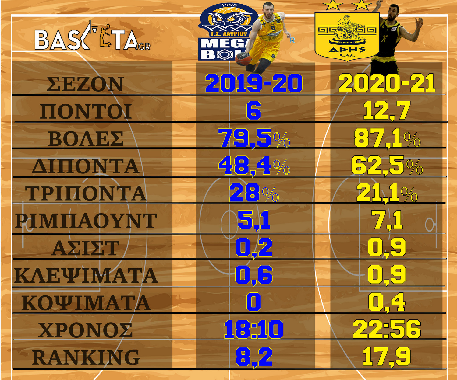 Η σύγκριση των αριθμών του με τον Άρη με τους αντίστοιχους του περσινού Πρωταθλήματος, φανερώνει το μέγεθος της βελτίωσης που δείχνει με ranking υπερδιπλάσιο της τελευταίας σεζόν του με το Λαύριο...