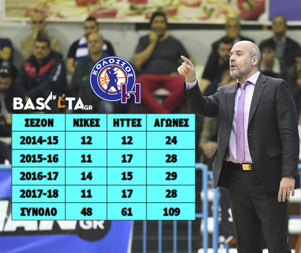 Αποχωρεί μετρώντας 48 νίκες και 61 ήττες σε 109 παιχνίδια στη Stoiximan.gr Basket League. Αναλυτικά αυτή η πορεία ανά σεζόν...