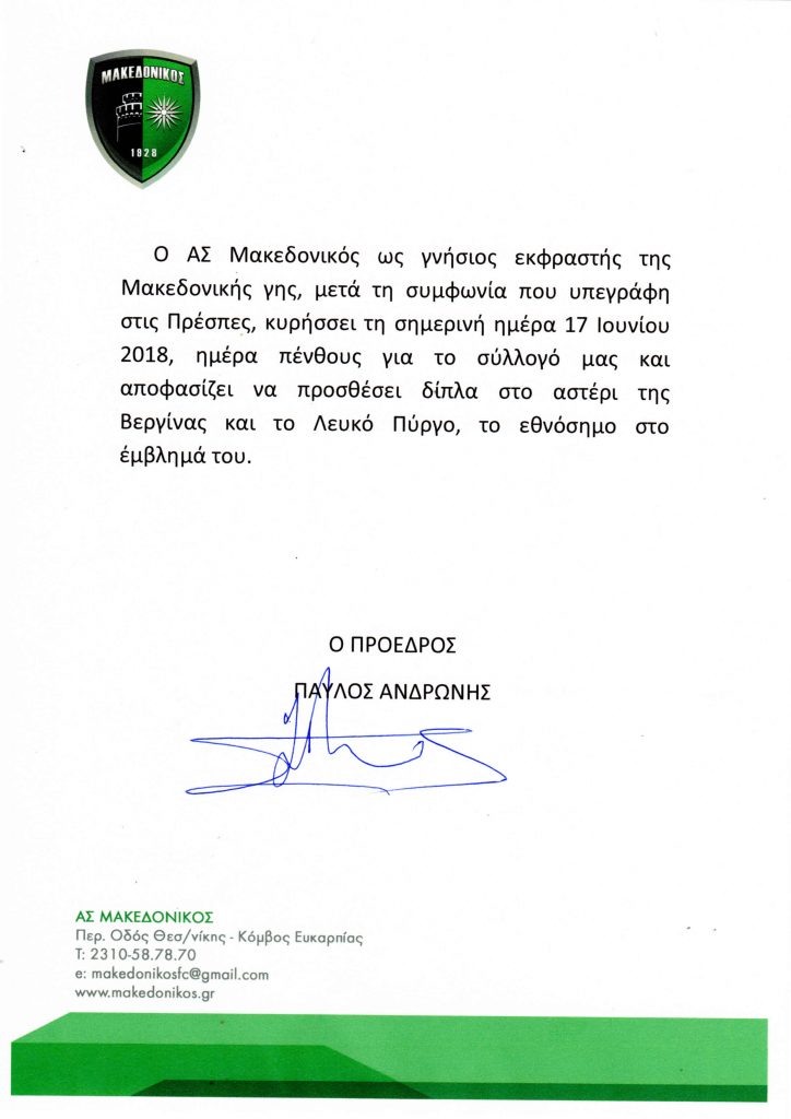 «O Α.Σ.Μακεδονικός ως γνήσιος εκφραστής της Μακεδονικής γης, μετά την συμφωνία που υπεγράφει στις Πρέσπες, κηρύσσει την σημερινή ημέρα 17 Ιουνίου 2018, ημέρα πένθους για τον σύλλογο μας και αποφασίζει να προσθέσει δίπλα στο αστέρι της Βεργίνας και τον Λευκό Πύργο, το εθνόσημο στο έμβλημά του.