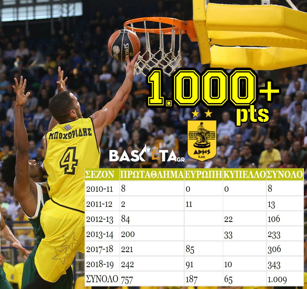 Ο Μποχωρίδης βρήκε επίσης θέση και στην πρώτη 15άδα των παικτών του Άρη με τα περισσότερα εύστοχα τρίποντα Πρωταθλήματος. Με τα δύο που είχε χθες, έφτασε τα 80 και ξεπέρασε τον Ντίνο Αγγελίδη που είχε 78 και τον Χρήστο Ταπούτο που είχε 79.