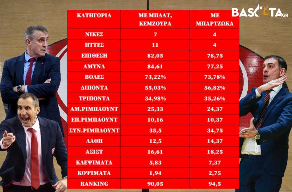 Ο Ολυμπιακός μέσα από αυτό το 4-4 επί Μπαρτζώκα δεν έγινε φαβορί αλλά διατήρησε τις ελπίδες του για τα πλέι οφ, σε μία έτσι κι αλλιώς περίπλοκη πια κατάσταση κοντά στην 8η θέση. Η σύγκριση όμως των αριθμών των δύο περιόδων της σεζόν, Μπλατ-Κεμζούρα και Μπαρτζώκα, δείχνουν κάποιες σημαντικές διαφορές. Ο Ολυμπιακός των τελευταίων αγωνιστικών σκοράρει λιγότερο (-3,3 πόντοι μέσο όρο) αλλά αμύνεται καλύτερα (-7,36 πόντοι μέσο όρο). Οι αποστάσεις είναι μικρές στις κατηγορίες των σουτ και των ριμπάουντ, όχι όμως και σε εκείνες της «οικονομίας». Ο Ολυμπιακός του δεύτερου διαστήματος κάνει περισσότερα λάθη (+1,87 μ.ό.), έχει όμως περισσότερες ασίστ (+1,64 μ.ό.), κλεψίματα (+1,54 μ.ό.) και κοψίματα (+0,81 μ.ό.).