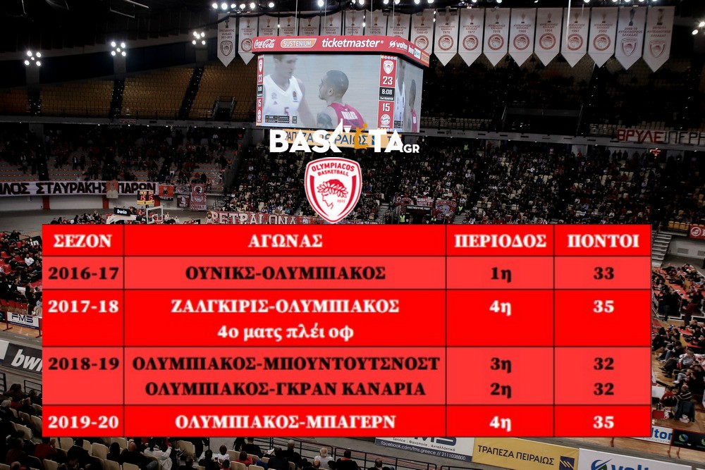 Οι 35 πόντοι τους στην επίθεση δεν αποτελούν απλά ρεκόρ περιόδου αφού είχαν από 31 πόντους στην πρώτη περίοδο του ματς με τη Βαλένθια στο ΣΕΦ, στην τρίτη περίοδο του ματς με τη Μιλάνο στο ΣΕΦ και στην τρίτη περίοδο του ματς με τη Βαλένθια στην Ισπανία. Πρόκειται για την ισοφάριση της κορυφαίας επιθετικής επίδοσης μιας περιόδου του Ολυμπιακού στα χρόνια του νέου format της Ευρωλίγκας. Στους τελευταίους 121 αγώνες του ο Ολυμπιακός έφτασε μία ακόμη φορά στους 35 πόντους ενός δεκαλέπτου και πάλι απέναντι στη Ζαλγκίρις. Ήταν στο τέταρτο παιχνίδι των πλέι οφ του 2018 στο Κάουνας.