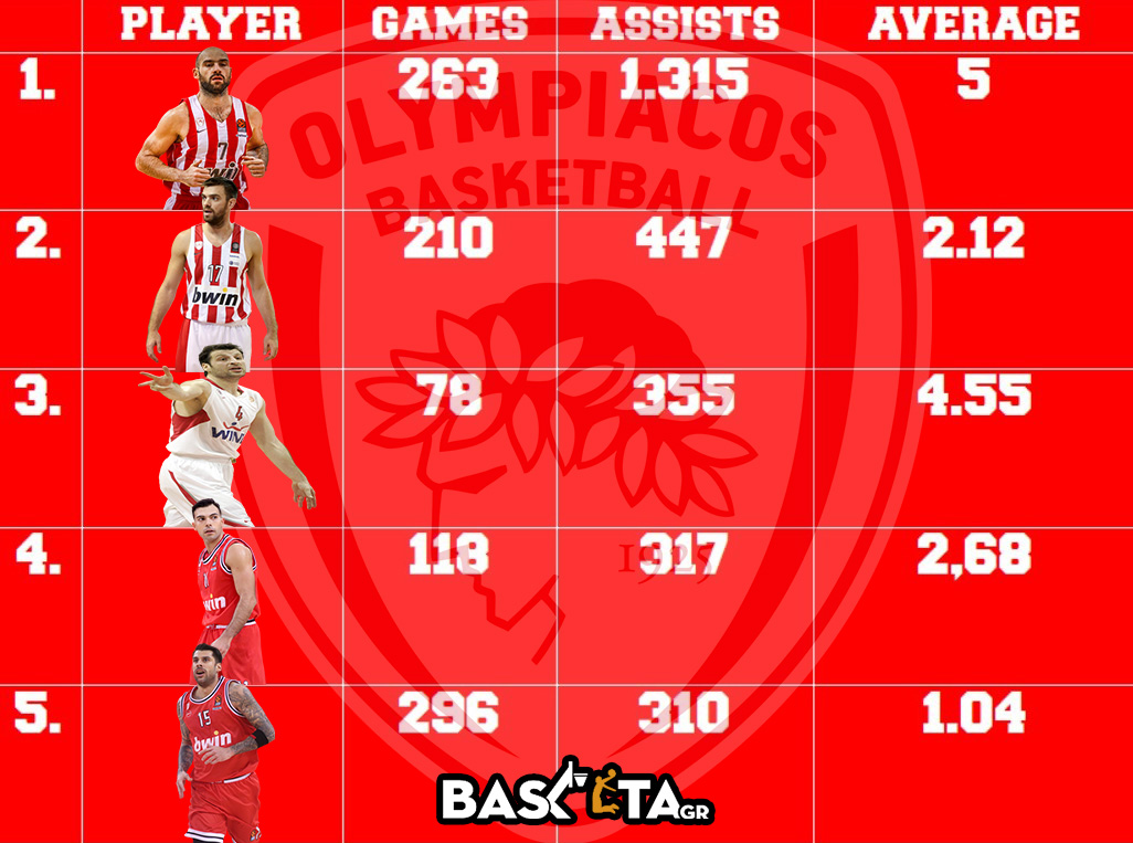 Στο γήπεδο στο οποίο πέρασε την τελευταία πενταετία, ο Κώστας Σλούκας μπορεί να μην έφτασε σε υψηλά επίπεδα απόδοσης, όμως έφτασε σε μία ξεχωριστή επίδοση. Με τις επτά ασίστ που είχε, έφτασε τις 317 με την ερυθρόλευκη φανέλα και έγινε ο 4ος πασέρ στην ιστορία του Ολυμπιακού στην Ευρωλίγκα.