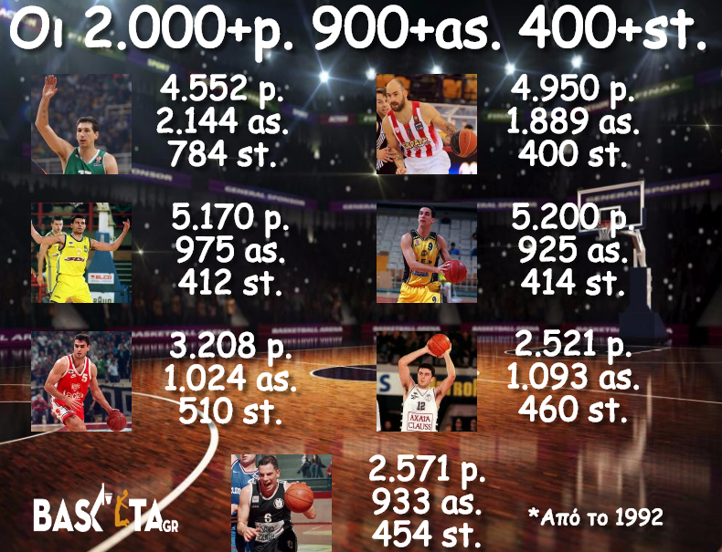 Παράλληλα μπήκε σε μία ιδιαίτερη λίστα παικτών που βάσει των αριθμών τους μπορούν να υπερηφανεύονται πως σε καμία περίπτωση δεν ήταν μονοδιάστατοι. Το basketa.gr συγκέντρωσε και σας παρουσιάζει τους συνολικά επτά παίκτες που στην καριέρα τους στο επαγγελματικό Πρωτάθλημα είχαν τουλάχιστον 2.000 πόντους, 900 ασίστ και 400 κλεψίματα. Τα ονόματα και μόνο ξυπνούν κάποιες από τις πιο όμορφες αναμνήσεις μας και υπενθυμίζουν πως το ελληνικό μπάσκετ έβγαλε πολλούς σπουδαίους γκαρντ πανευρωπαϊκής εμβέλειας μετά τα «ιερά τέρατα» των δεκαετιών πριν τα 90s.