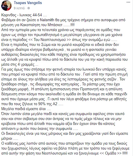 Ωστόσο, η ήττα στο Ηράκλειο και η σημερινή νίκη με το ισχνό 54-44 στην Κόρινθο, προβλημάτισε τον Βαγγέλη Τσάπα, ο οποίος μέσω της προσωπικής του σελίδας στο facebook χτύπησε καμπάνες, τονίζοντας ότι ο Ιωνικός πρέπει να ξαναγίνει ομάδα.