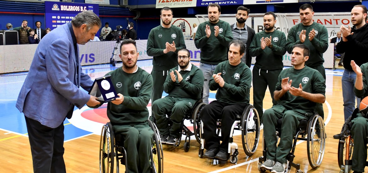 Στο ημίχρονο του αγώνα του Χολαργού με τον Παναθηναϊκό για την 25η αγωνιστική της Basket League, η διοίκηση των γηπεδούχων βράβευσε το τμήμα μπάσκετ με αμαξίδιο του Παναθηναϊκού.