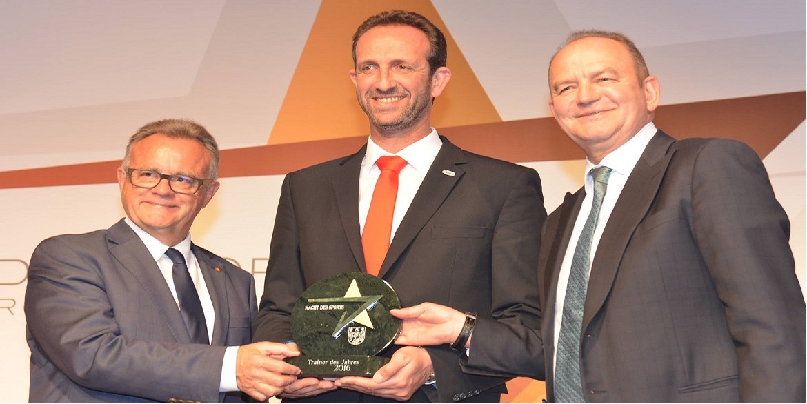 Το τρόπαιο για τον κορυφαίο προπονητή του 2016 στην Αυστρία παρέλαβε με... καμάρι ο Κρις Χουγκάζ, ο οποίος έκανε τις αφιερώσεις του.