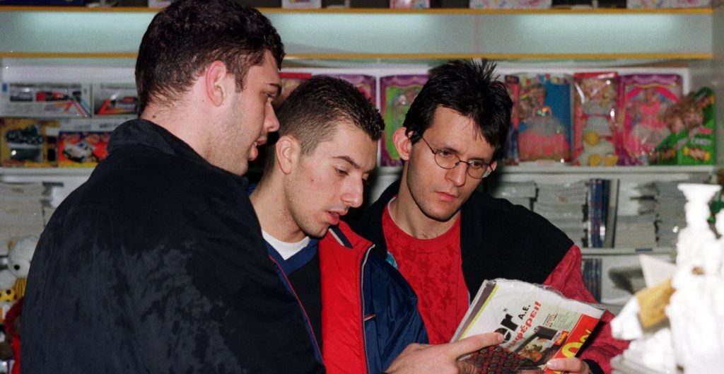 Με τους συμπαίκτες του στον Ολυμπιακό του 1997-98, Δημήτρη Παπανικολάου και Θύμιο Μπακατσιά