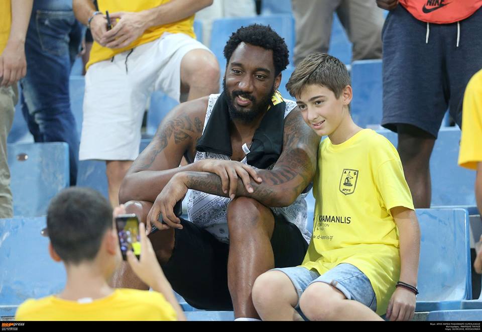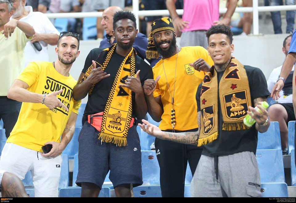 Οι παίκτες του μπάσκετ εκπροσώπησαν δυναμικά τον Άρη στην κερκίδα, αφού έφτασαν ντυμένοι στα κιτρινόμαυρα με κασκόλ της ομάδας, φωτογραφήθηκαν με τους φίλους της ομάδας και πανηγύρισαν τη νίκη με 2-0 επί της ΑΕΛ.