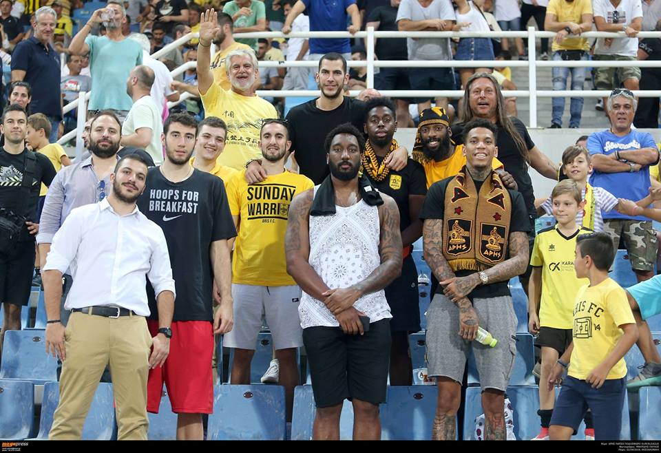 Οι παίκτες του μπάσκετ εκπροσώπησαν δυναμικά τον Άρη στην κερκίδα, αφού έφτασαν ντυμένοι στα κιτρινόμαυρα με κασκόλ της ομάδας, φωτογραφήθηκαν με τους φίλους της ομάδας και πανηγύρισαν τη νίκη με 2-0 επί της ΑΕΛ.