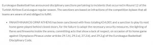 Οπότε λίγες ώρες πριν την μεγάλη αναμέτρηση με την Φενέρμπαχτσε του Ζέλικο Ομπράντοβιτς ο Παναθηναϊκός ενημερώθηκε ότι θα αγωνιστεί σε άδειο γήπεδο ενώ ήδη είχαν πωληθεί αρκετά εισιτήρια στον κόσμο του «τριφυλλιού». Εκτός της τιμωρίας της έδρας για έναν αγώνα η ΚΑΕ Παναθηναϊκός θα πρέπει να πληρώσει το ποσό των 54.001 ευρώ!